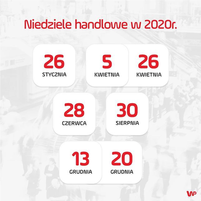 Niedziele handlowe w 2020 26 stycznia 5 kwietnia 26 kwietnia 28 czerwca 30 sierpnia 13 grudnia 20 grudnia. 30 sierpnia sklepy będą otwarte! W sklepach obowiązuje… w niedzielę, 13 grudnia tego roku sklepy będą otwarte. Gdzie tego dnia zrobić zakupy. O ograniczeniu handlu w niedziele i święta oraz w niektóre inne dni, która wprowadza zakaz handlu we wskazane niedziele, począwszy od 1 marca 2018 roku.